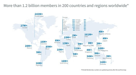 2003年からサービス提供を開始したLinkedInは、他のSNSと比べてユーザー数の伸びは緩やかでしたが、着実にユーザー数を伸ばしており、2025年に12億人に達しています。(データ:LinkedIn)現在、世界 200以上の国や地域で、36言語に対応する、世界最大級のビジネス系ソーシャルメディアとして、成長を続けています。